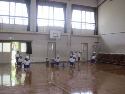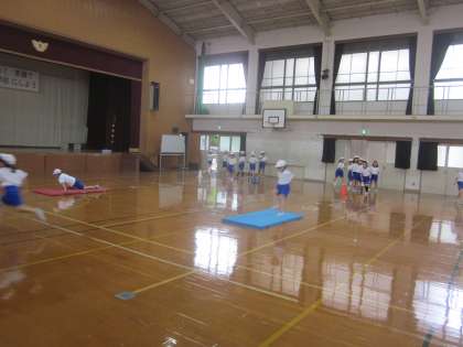 とびくらべの学習を始めました。「5歩とび」「しまとび」「ゴムとび」などに挑戦しました。全身を使ってよく跳んでいました。