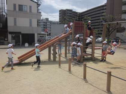 校区探検へ行きました。今回は,星池公園へむけて出発し,遊んだ後,千本通りを歩いて帰ってきました。たくさんのお店や人,ものを見つけられました。