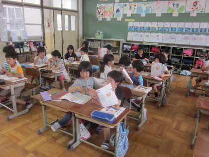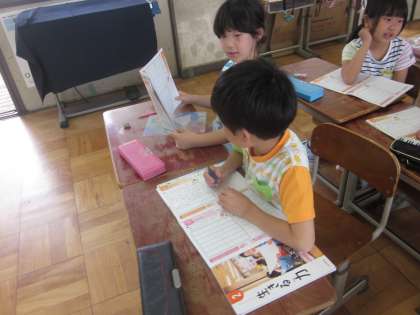 今日は,「ありがとうって言われたよ」のお話を読んで,やさしくすることについて考えました。人にやさしくして「ありがとう」と言われると,自分もうれしい気持ちになることに気づいたようです。