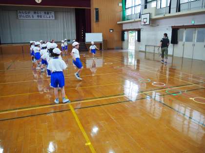 床に丸いマークをおいてそれをはずさないようにとんでいきます。みんながんばってチャレンジしています。