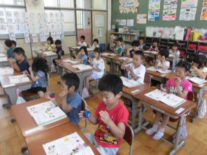歌に合わせて「たん・たん・たん・うん」のリズムを手拍子やカスタネットで打ちました。カスタネットの打ち方を学び,上手にリズムを打つことができました。最後は,隣同士で見合いっこしました。