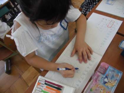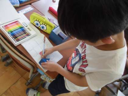 積み木の面の形をうつして絵をかきました。三角や四角,円を組み合わせ,ロボットやアイスクリーム,乗り物などいろいろ工夫していました。