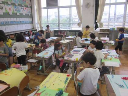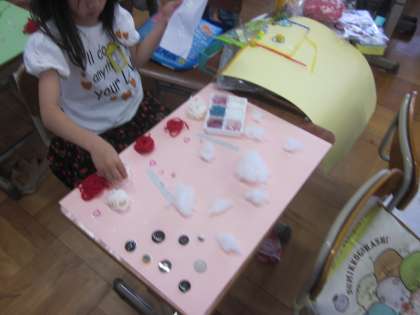 ざいりょうからひらめきの学習の続きです。材料から想像したものを画用紙にボンドやのりを使ってくっつけました。仕上げは来週です。