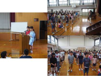 7月9日(火)児童朝会を行いました。今回は、全員合唱、そして飼育委員会からウサギのモモちゃんに関するクイズ、図書委員会かた選書会で講習を決めて図書室に配架された本の紹介、6年からの修学旅行の報告、計画委員会から廊下を走らないキャンペーンについて報告がありました。どの委員会も学年も、しっかりみんなの前で話ができるようになってきました。これからもがんばってください。