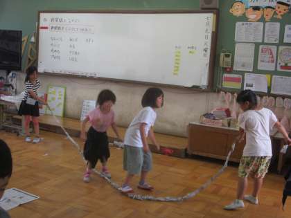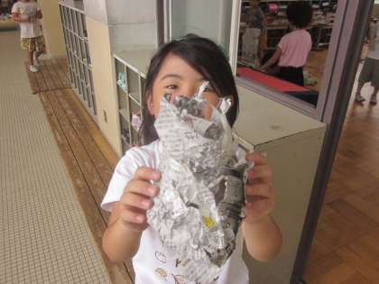 図工で「新聞紙となかよし」という学習をしました。新聞紙をちぎったり,並べたり,握ったり…いろいろ工夫して形をかえながら新聞紙となかよしになりました。ちぎった新聞紙を舞い上げてあそんだり,握ったものをつなげてなんと長縄にしたりしていました。靴やスカートなどいろいろ楽しい作品もありました。
