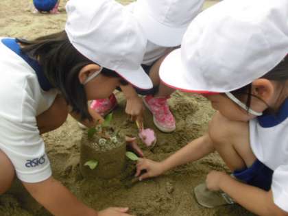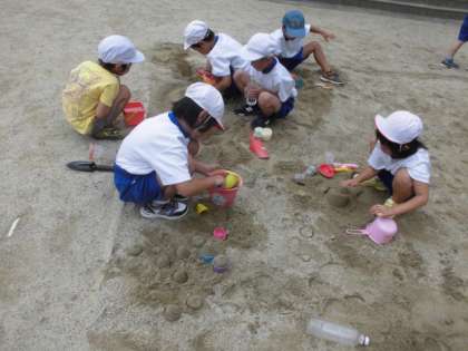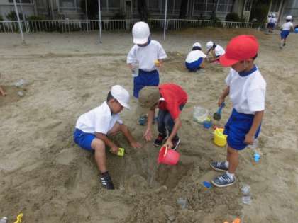 砂場で砂や土を触って楽しむ学習をしました。カップを使って形を作ったり,ひたすら穴を掘ったり,水を流したり・・・。友だちと交流する中で,いろいろなアイディアが浮かび,どんどん活動が変化していく様子が見られました。