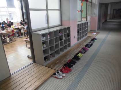 給食時間に,当番のお友達が食器などをもって教室に入った後,だれかが(知っていますが)靴をそろえてくれています。初めは,一人のお友達がそろえてくれていたのですが,少しずつ広がって何人かのお友達が気を付けてそろえてくれています。素敵な行動がもっと広がっていけば嬉しいです。