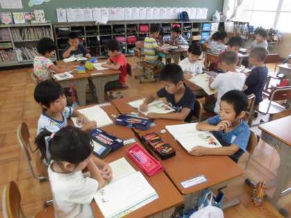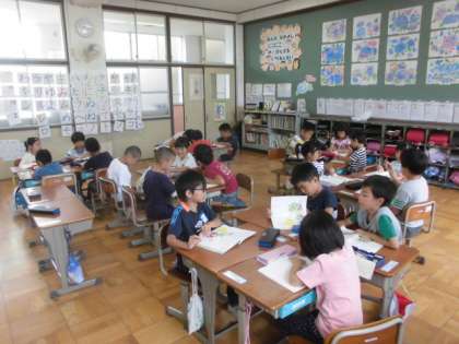 音読発表会に向けて練習中です。読み方や動きを工夫しながら進めています。
