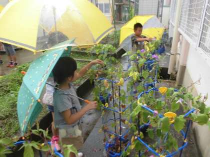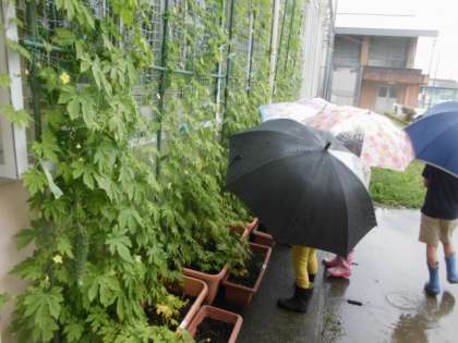 今年の朝顔は成長が早く,すでに緑色の種ができている子がたくさんいます。いくつ種ができるか今から楽しみです。また,緑のカーテンのゴーヤも観察しました。大きな実がいくつかできています。