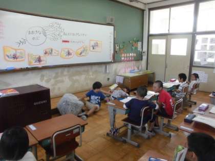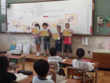 班ごとに「おおきなかぶ」の音読発表をしました。動きをつけたり,声を合わせたり,それぞれ工夫しながら楽しく読むことができました。発表後,感想を交流し合いました。