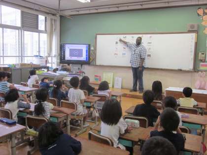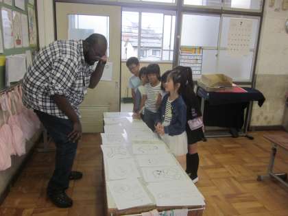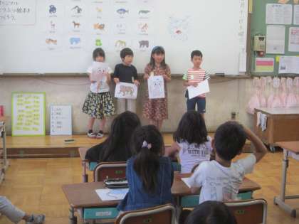 オリジナル動物絵本を作りました。まずはテビン先生に色塗りしたい動物のカードをもらいました。そして好きな色を塗り,Brown Bearの本に合わせて発表しました。