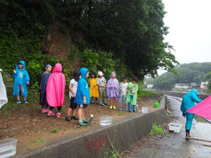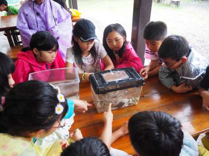 かご網漁のかごを挙げたのですが、4班のかごに小魚が2匹のみという結果でした。そこでみさきの家にある水槽にいるカサゴ、フグ、ヤドカリ、タコ、ウニなどを水槽に移してもらい、各班各自それぞれの生物に触れてみる体験をしました。子どもたちからはタコの感触、特に吸盤の感触に興味津々の様子でした。