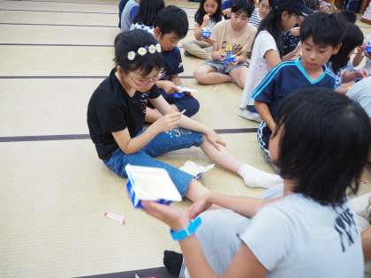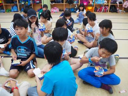 7月16日(火)みさきの家2日目です。プレイホールでの活動が終わり、休憩時間です。アイスクリームをみんなで食べてほっこり中。