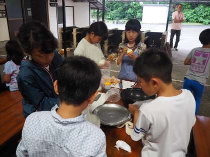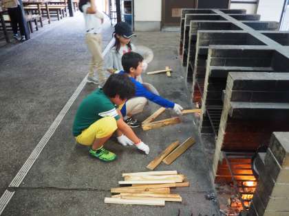 野外炊飯は続きます。お鍋に具材が入ったら、かまどに火を入れます。みんな手なみが良いです。すぐに火が付きました。