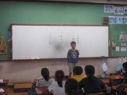 みんなの前で活動報告書を読んでいます。