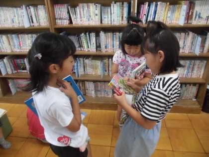 夏休みに向けて,図書室で好きな本を借りました。友だちと一緒に読んだり,お勧めし合ったりするのも楽しいようです。せっかくの夏休みだからこそ,ちょっと長めの本やいつもと違う種類の本など,いろいろ挑戦してほしいと思います。