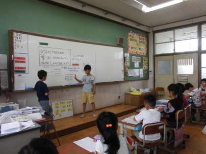 一人が考え方を説明しています。そのうち別のもう一人も説明に参加し,聞いているみんなもわかりやすい授業でした。さすが!3年生。