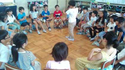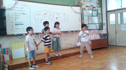 お楽しみ会として始めましたが,本当は1学期で転校する友だちにありがとうの気持ちを伝えたいと開いたお別れ会でした。みんな遊びでは,はんかち落とし,なんでもバスケットをしました。そしてお笑い係の発表のあと,みんなで作ったプレゼントを渡しました。また,いつか会えることを願って…