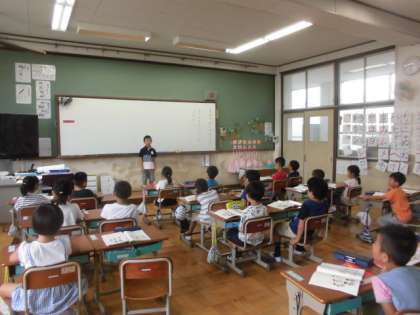 夏休みにしたことからみんなに知らせたいことを選び,簡単な文で紹介する学習をしています。発表者は相手に伝わるよう,聞く側は質問や感想を考えながら聴くことを意識しています。子どもならでは視点もあり,なかなか面白い発表会になっています。