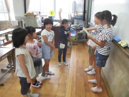 休み時間も元気いっぱいです。運動場では,ボール投げやおにごっこ,遊具遊びをしていました。教室では,反対言葉クイズで盛り上がっていました。「むー・ごー・しー・けー,何でしょう。」長い言葉になると,大人でも意外と難しいです。帰りの会でも,クイズ係がたくさん問題を出してくれました。