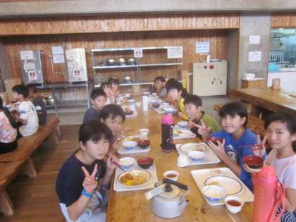 9月3日(火)山の家での2日目の夕食です。おかずはバイキングです。思い思いに自分の好きなおかずをとり、班ごとに食事をとっていました。食事のあとは、お風呂、そして天体観測です。晴れるといいなあ。