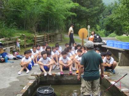 この日の魚はイワナとアマゴです。なかなか、泳いでいる魚はつかめないものです。こどもたちは悪戦苦闘の末、キャッチ、そして調理へ進んでいきます。魚をさばく体験も初めての子どももいるようで、恐る恐るの手さばきでした。