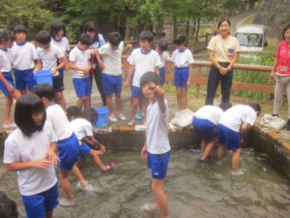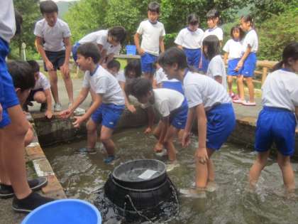 9月4日(水)4日目の午前の活動は魚つかみ、そしてその魚をさばいて塩焼きにします。