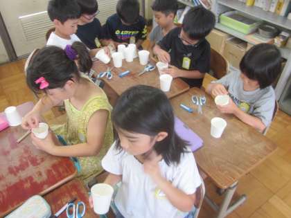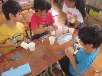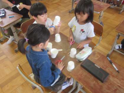 生活科の学習では,「あそんでためしてくふうして」の学習を始めました。紙コップ飛ばしにチャレンジです。どうやったら高く飛ぶかな?自分で工夫したり,友達と相談したりして作っています。