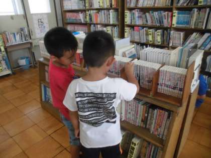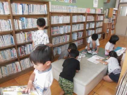 久しぶりにみんなで図書室へ行きました。好きな本を読んだり,借りたりしました。物語では,「おしりたんてい」シリーズが人気なようです。危険生物や怪談などの怖いものも好きな子が多いです。