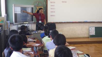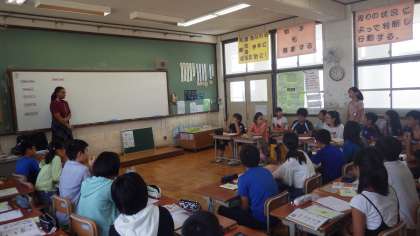 新しいALTの先生の自己紹介後,自分達の自己紹介をしました。5年生で学んだことを使って話したり,質問したりしていました。