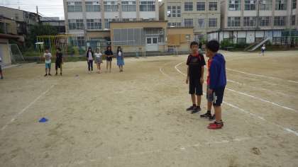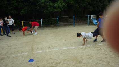 足を痛めて走れない人でもリレーができるようにと,みんな遊び係の人達が考えました。