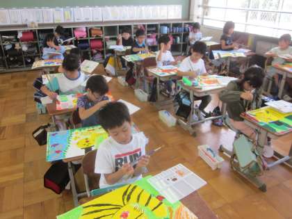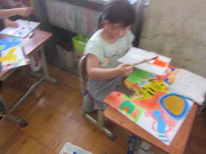 見て見てお話の絵の背景を絵の具で塗りました。水の量をいろいろにして濃さを工夫しました。
