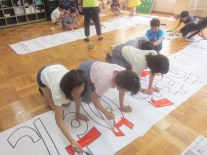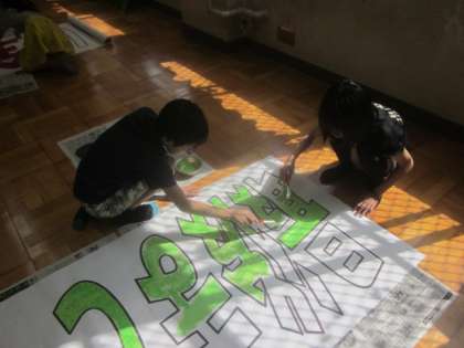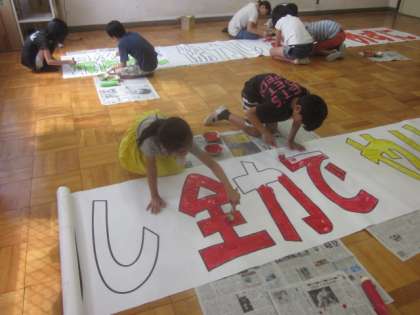 司会係さん,代表委員さんが運動会の掲示用のスローガン作り頑張っています。