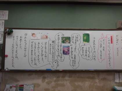 今週の道徳は「いのち」について考えました。人だけでなく植物や動物にも「いのち」があること,「いのち」は一つで大事なもの,などたくさんの意見が出ました。最後は,自分たちも7年前に産まれ,毎年誕生日を祝ってもらっていることを振り返りました。ぜひ,おうちでも生まれたときの様子をお話してみてください。