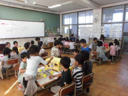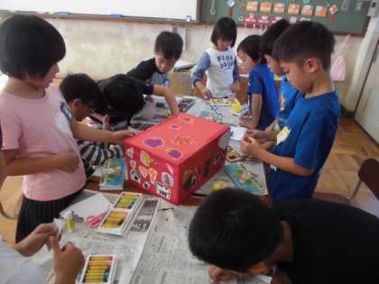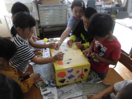 団体競技で使うおみこしの飾りつけを1・2年合同でしました。「秋」をテーマに絵を描きました。にぎやかで楽しいおみこしになりそうです。