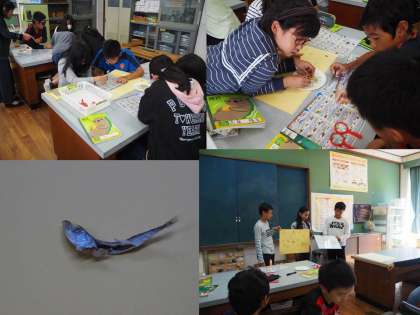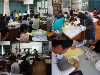 10月16日(水)3時間目と4時間目に私(校長)が理科の特別授業を行いました。テーマは生物どうしのつながりです。チリメンモンスターを使って、食物連鎖のしくみを見出していきます。地道にカタクチイワシ、マイワシ、アジなどの種類ごとに生物を分けて、固体数を数えます。またチリメンモンスターどうしの中での食べる、食べられるの関係をタブレットを使って調べます。中には小さなマイワシのおなかのなかに食べられたオキアミが入っているのを発見した班もありました。いろんな気づきがあったようです。それぞれ調べたことを班の中でまとめ、発表していきました。
