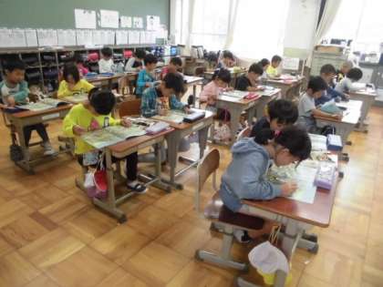 今日は,『どうしたら生き物と仲良くできるか』について話し合いました。「毎日お世話をする」「一緒に遊ぶ」「優しくして,嫌がることをしない」「図鑑などで調べて学ぶ」「できるだけ一緒の時間を多くする」など,たくさんの意見が出ました。最後に,京都市発行の「いきものとなかよし」の冊子を使って,楽しく学びました。