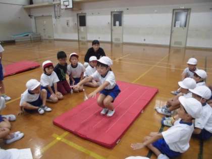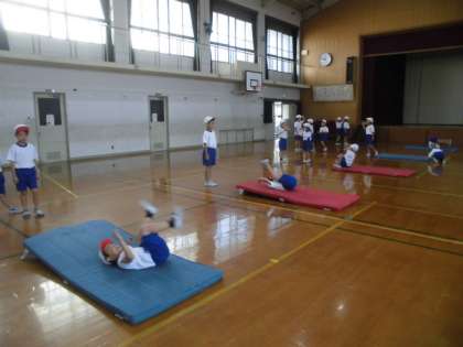 「よこまわり」「まえまわり」「うしろまわり」を練習中です。坂道の場,細マットの場,平らな場など,自分にあった場所で挑戦しています。友だちを見ることも効果的で,上手に回るポイントをたくさん学んでいました。