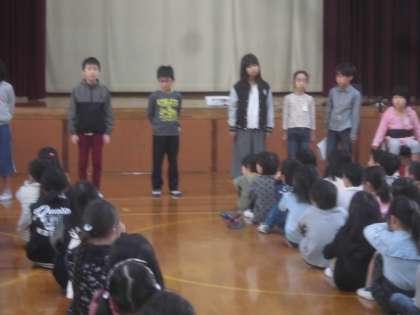 今朝は,児童朝会。全校合唱で『U&I』を歌った後,後期学級委員等の認証式・計画委員と3年生による寸劇(ルールを守ること)がありました。