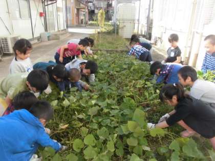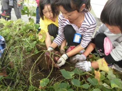 5月の連休明けから育てていたサツマイモを掘りました。小さいものから大きいものまで,約30個も収穫できました。「どうやって食べる?」「先生やほかの学年の人にもあげたいな〜」とその後がさらに楽しみな様子でした。