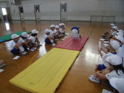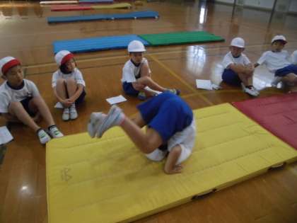 今日でマット遊びの学習が終わりなので,最後に発表会をしました。前回りと後ろ回りの連続技を披露しました。練習の成果を発揮し,堂々と発表していました。終わった後,上手な子の技をもう一度見たいと「アンコール!アンコール!」の声が。指名された子たちがもう一度技を披露すると,大きな拍手が起こっていました。