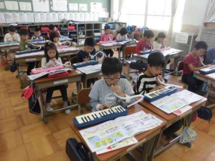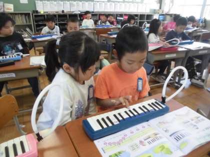 鍵盤ハーモニカで「かえるのがっしょう」を練習中です。親指のお引越しがポイントの曲です。まずは指使いだけ練習し,隣同士でも見合いっこし,いざ本番。初めてにしては,なかなか上手に吹けていました。