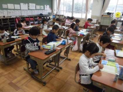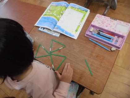 今日は,棒を並べていろいろな形をつくる学習をしました。教科書の形を作ったあとは,10本までの棒を使って好きな形をつくりました。ロケット,犬,星,ロボットなど楽しい形がたくさんできました。