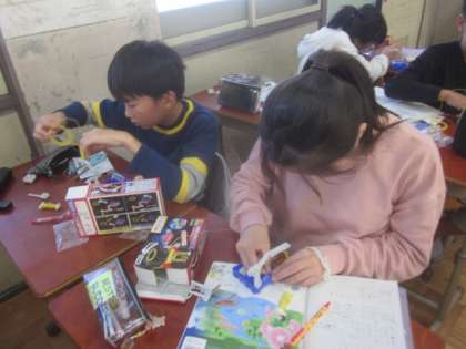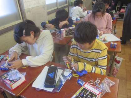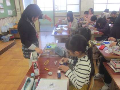 電磁石が鉄を引きつける力をもっと強くするにはどうしたらいいか考え,実験しています。