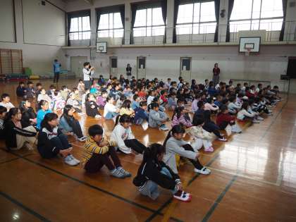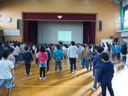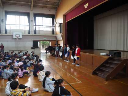 11月12日(火)児童朝会が行われました。計画委員の児童の司会で進行します。朱六ソングの全校合唱から始まり、今回は給食委員の子どもたちからのクイズです。給食に関わるクイズを順番に出題します。ところで校長先生の好きな給食メニューは何でしょう?答えはお子さんから聞いてください。