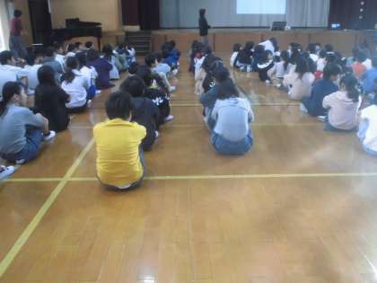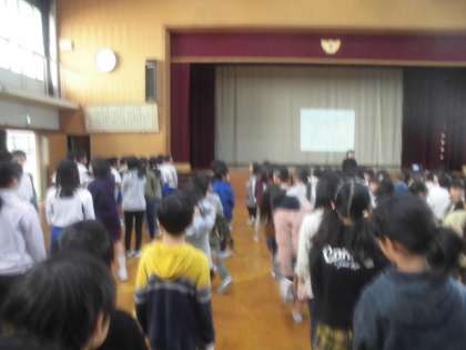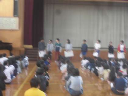 今朝の児童朝会は,『Y&I』の全校合唱と,給食委員さんからのクイズでした。クイズでは,みんな正解すると「やったぁ」ととても喜んでいました。校長先生の好きな給食がビビンバだということも分かりました。給食委員さん,楽しいクイズをありがとうございました。