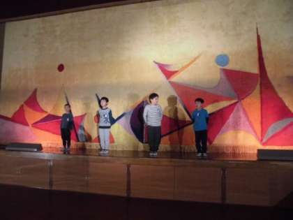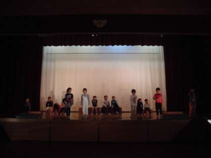 会場の電気を消し,舞台上とスポットライトだけで演技をしてみました。いつもと雰囲気が違うなかで少し緊張が見られた気もしましたが,一生懸命動きをつけながらがんばっていました。