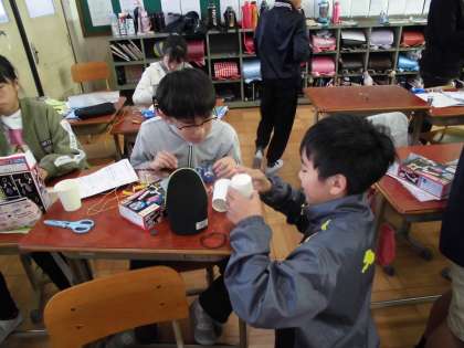電磁石の性質を利用したおもちゃ作りに取り組んでいます。