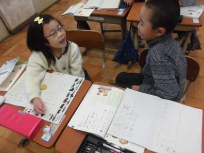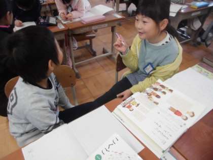 隣の席の友だちに,今一番楽しいことを聞いています。聞き取ったことをノートにメモし,みんなの前で紹介します。楽しいことだけでなく,「なぜ楽しいのですか」「だれとしますか」など,いろいろ考えて質問をしていました。どんな発表になるか楽しみです。
