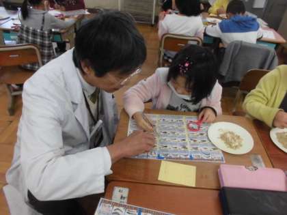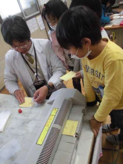 お気に入りが見つかったら,紙に貼って,ラミネートをしてもらい・・・世界に一つの「チリモンカード」の完成です。子どもたちは,嬉しそうにカードを見せ合っていました。
